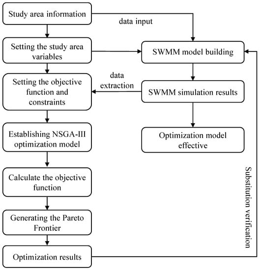 In order to avoid a large difference between the manual optimization design scheme and the actual situation in the study area, the SWMM model and the NSGA-III optimization algorithm are combined to form an optimization model, which is a four-objective optimization model established for the purpose of optimizing the combination design and total investment cost of the sponge-type comprehensive pipe corridor rainwater chamber, which takes into account the rainwater control and the condition of the rainwater network system, as well as the total investment cost of the construction and management phases.