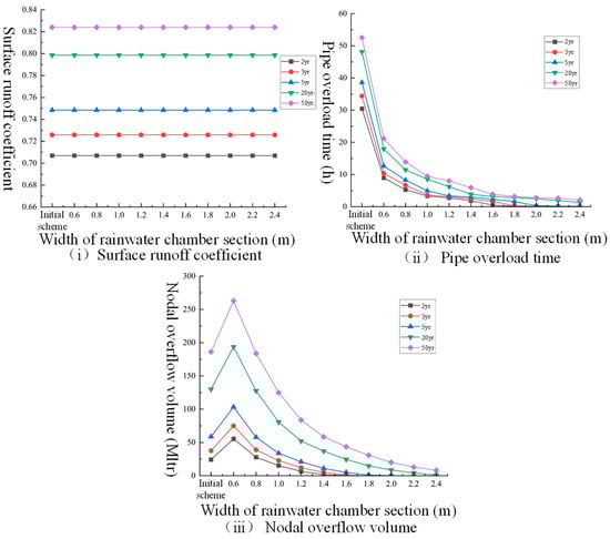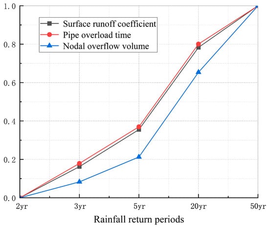 An increase in the rainfall return period increases the risk of urban flooding. Figure 13 shows the normalized SWMM model simulation results for the initial design scheme under five different rainfall return periods, and the increase in rainfall return period will cause the three indicators to increase to different degrees. When the rainfall return period is increased from 2 yr to 50 yr and the surface runoff coefficient, pipe overload time, and nodal overflow volume increase by 15.05%, 45.19%, and 86.93%, respectively, the increase in rainfall return period has a greater impact on the nodal overflow volume than the other two. The reason for the increase in all three evaluation indicators is the influence of rainfall intensity and surface storage. When the rainfall intensity is high, the surface storage is filled up in the initial stage of rainfall, and when the rainfall peak comes, the high-intensity rainfall is completely transformed into direct runoff. On the contrary, if the rainfall intensity is low, the surface storage is not filled before the rain peak, which will cut the intensity of surface runoff to some extent [43].