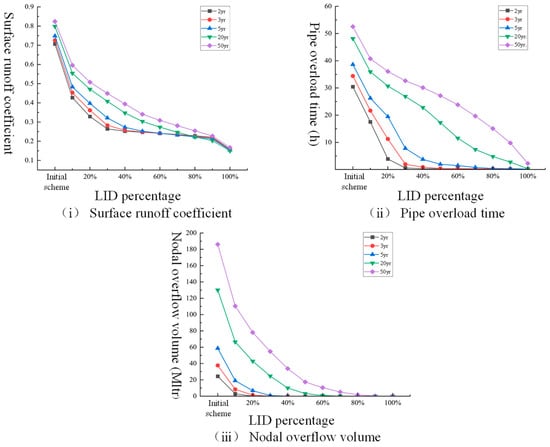 Effect of different LID percentages on the three indicators under different rainfall return periods.