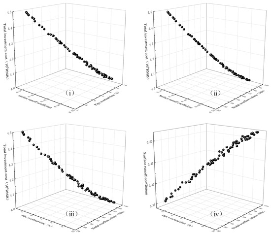 The results of each optimization algorithm will be different; record the set of optimized solutions obtained each time, and select a set of optimized solution sets with reasonable tradeoffs between the four objectives and good convergence to give examples in the article. The three-dimensional diagram of the Pareto front obtained by the optimization algorithm is shown in Figure 10i–ⅳ. Each point in the figure is a solution in the optimization scheme, and these points constitute the Pareto frontier. (i)–(iii) represents the relationship between the three indicators of urban flooding and the construction cost. The Pareto frontiers of these three plots are more convergent and have better continuity. All three indicators decrease with the increase in total investment costs for different design options. (iv) represents the relationship between the three indicators with a more dispersed Pareto frontier, indicating that the optimization algorithm weighs the three indicators differently.