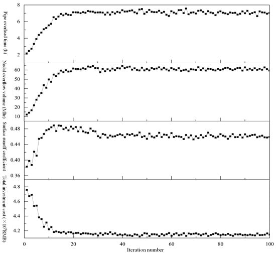 The surface runoff coefficient starts to converge at about 40 generations, the pipe overload time starts to converge at about 20 generations, the nodal overflow volume starts to converge at about 30 generations, the total investment cost starts to converge at about 20 generations, and all the objective functions reach convergence after 45 generations. The optimization results after convergence can be obtained when the number of iterations is set to 100 generations. In the converged state, the average value of the objective functions is lower than the simulation results of the initial design scheme, which proves the effectiveness of the optimization model.