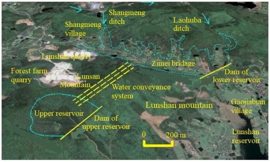 Taking argillaceous dolomite in the JPSPS as the research object, the power station is located in Jurong City, Jiangsu Province, about 26 km from Jurong city, and 65 km from Nanjing City, China [25]. The total installed capacity is 1350 MW. The normal storage level of the upper reservoir is 267 m with a total storage capacity of 17.44 million m3. The normal storage level of the lower reservoir is 81 m with a total storage capacity of 20.35 million m3. The power station consists of the upper and lower reservoirs, dams, water conveyance systems, underground powerhouses, and permanent flood discharge structures (Figure 1) [26]. The upper reservoir is located on the southwest side of the main peak of Lunshan Mountain and is formed by excavating and filling the valleys of the main peak of Lunshan Mountain. The lower reservoir is formed by damming at the Zimei Bridge, which is mainly located at the tail of Lunshan Reservoir. It is equipped with drainage holes and a spillway. Within the main peak of Lunshan Mountain, the water conveyance system and underground powerhouses are placed with a total length of approximately 1400 m. The underground powerhouse area is mainly located at elevations of 30 m to 40 m.