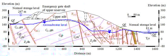 The strata in the power station area belong to the Ningzhen Formation, the Lower Yangtze Formation, and the Yangtze Formation Region. The lithology is mainly Sinian, Cambrian, and Permian strata (Figure 2) [26]. Sinian Dengying Group (Z2dn) mainly consists of fine crystal dolomite and internal clastic dolomite with a thickness of 150–227 m. The Cambrian Guanyintai Group (∈2–3gn) is mainly composed of chert-bearing nodules or chert-banded dolomite mixed with argillaceous and calcareous dolomite with a thickness of 150–210 m. Baotaishan Group (∈1p) mainly consists of a thin (less than 10 cm) to medium (10–50 cm) layer of argillaceous dolomite, siliceous dolomite, and cataclastic dolomite with an exposed thickness of 39–78 m. The argillaceous dolomite is thin, and the surface is strongly weathered. The upper section of the Mufushan Group (∈1m2) is mainly composed of phosphorous siliceous rock, phosphorous limestone dolomite, phosphorite, thick-bedded. Permian Longtan Group (P2l) comprises carbonaceous mudstone and argillaceous siltstone, which is distributed around the water inlet or outlet of the lower reservoir with a thickness of about 100 m.