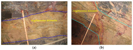 Photos of argillaceous dolomite in the study area (a) upper reservoir, and (b) underground powerhouse.