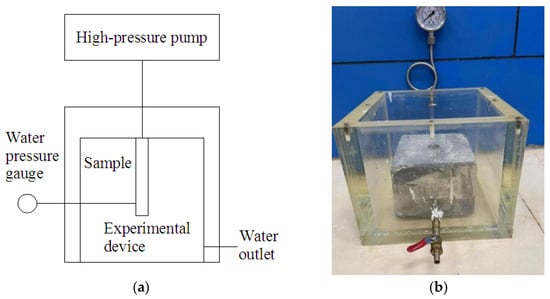 The test specimens were taken from the weak interlayers of argillaceous dolomite in the underground powerhouse (Table 1). These specimens were processed into specimens measuring 150 mm × 150 mm × 1500 mm. The middle location of the specimen was drilled (hole-diameter of 20 mm and a depth of 100 mm), and the small hole was connected to a high pressure water pump. The pressures measuring hole and water outlet hole were set on the side, and the diameter is 6 mm. The water outlet hole was not connected to the test hole, while the pressure measuring hole was connected to the test hole. Also, the hole was connected to a water pressure gauge with a measurement range of 0–8 MPa by a hose with a wall thickness of 100 mm. The accuracy of the water pressure gauge is 0.1 MPa. The experimental model device measured 350 mm × 350 mm × 350 mm, which was composed of organic glass with a thickness of 50 mm. The specimen was placed in the middle of the device, at a certain distance from the side-wall of the specimen holding device. The purpose was to avoid the lateral pressure of the specimen in contact with the side wall of the device during the test, and the resulting water pressure measured in the test is small and tends to be safe. During the experiment, the water pressure gradually increased. Meanwhile, the water pressure and flow rate were recorded each time, and the seepage failure of the rock specimens was observed. Under the action of the high water head, due to the presence of small fractures in the rock samples, there was a phenomenon of stress concentration at the fracture tip, which caused the fractures to expand and induces seepage failure, also known as hydraulic fracturing.