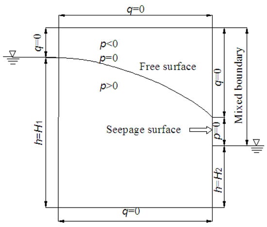 The overflow boundary belongs to the third type of boundary condition, which combines the flow boundary and the head boundary Figure 5. In COMSOL, the meaning of the mixed boundary is to divide the boundary into two types of boundaries. The part above the free surface is the second type of boundary condition (zero-flow boundary), and there is no other pressure at the seepage surface except for the strong atmospheric pressure. Therefore, the location of the seepage surface is the first type of boundary condition, which only has a position head boundary (H = z). The calculation of mixed boundary-free surfaces is relatively complex, and currently it is mainly solved through continuous iterative approximation to obtain approximate solutions.