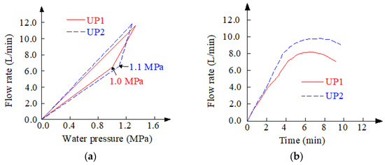 The P-Q and Q-t curves were drawn for two experiments based on the experimental results in Figure 4. The solid line in Figure 6a represents the pressure rise curve, while the dashed line represents the pressure drop curve. When the specimen undergoes seepage failure, the flow rate is found to increase, which indicates that under the action of test pressure, the microfractures present in the specimen have expanded or penetrated, and this seepage failure is irreversible. Figure 6b indicates that, before reaching the critical water pressure for specimen failure, the flow rate increases linearly with time. After exceeding the critical water pressure, due to rock failure, the slope increases, and the flow rate decreases with time.