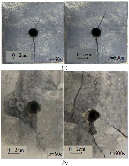 With the increase in water pressure, there was no significant change in specimen UP1. When the water pressure increased to 1.0 MPa, cracks appeared in the sample, and the amount of water pressed into the specimen also increased, which indicates the specimen failure. Figure 7a shows the failure of the specimen when the water pressure stabilizes at 1 MPa. After 60 s, obvious cracks appeared in the sample, which gradually became larger. After 600 s, the crack size remained stable. Similar to UP1, when the water pressure increases to 1.1 MPa, the flow rate undergoes a significant change after 30 s for the specimen UP2, and visible cracks begin to appear at 60 s (Figure 7b). After 600 s, the number and size of cracks around the specimen increase significantly.