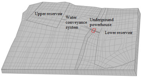 The numerical simulation of groundwater flow in this project adopts polyhedral element discretization. For important areas, the mesh has been encrypted to meet the accuracy requirements of the model. The 3D model considers the upper reservoir, water conveyance system, underground powerhouse, lower reservoir, and other hydraulic structures of JPSPS, and finally generates 5,182,416 elements and 628,452 nodes (Figure 8).