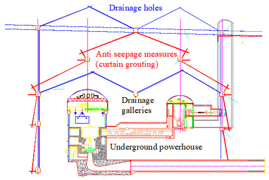 Design schemes of anti-seepage and drainage for underground powerhouse area and calculated water pressures.
