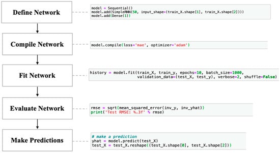 An RNN model is suitable for making predictions on sequence data. This study aimed to develop a sequence prediction model that performs the best result. There are five steps to establish a simple RNN model (Figure 4) and LSTM model (Figure 5), as follows [24]: