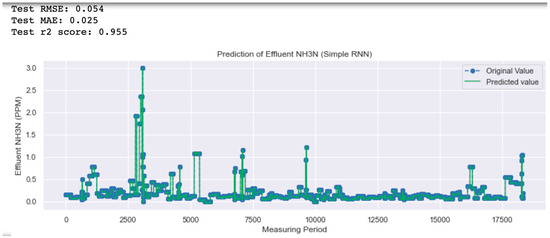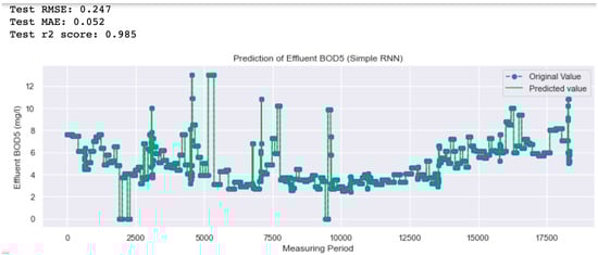 Figure 7 shows the prediction result of effluent BOD5 from 2015 to 2018 using the simple RNN algorithm. The original value is very close to the predicted value, which has an RMSE of 0.247 and MAE of 0.052, which are small RMSE and MAE values. It means that the model is optimal and predicts an excellent in-sample fit.