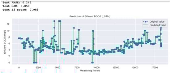 Figure 8 illustrates the predicted effluent BOD5 from 2015 to 2018, as determined by the LSTM model. The predicted results align closely with the original data, indicating the accuracy of the prediction model. The model’s root mean square error (RMSE) is 0.246, a relatively small value, signifying that the model commits minor errors, minimizing the risk of overfitting or underfitting. Hence, the original dataset spanning from 2015 to 2018 provides a well-suited fit for the models. These models can learn and retain the pattern, enabling them to predict the effluent BOD5 accurately.