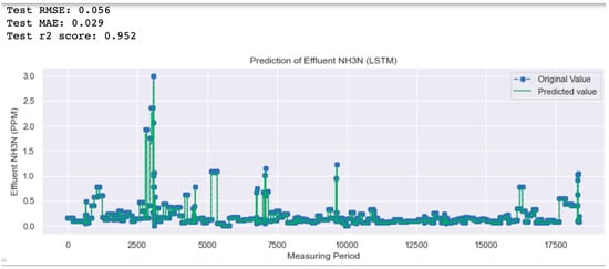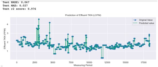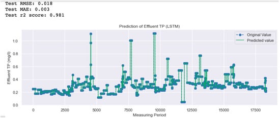 Therefore, the original dataset from 2015 to 2018 is an excellent fit. The models can learn and remember the pattern to accurately predict the effluent BOD5. The next step is to develop a model for other essential effluent parameters: TP, TKN, TSS, and NH3-N. The model applied 100 batch sizes and 50 epochs, which created the best model performance. Figure 9, Figure 10, Figure 11, Figure 12, Figure 13, Figure 14, Figure 15 and Figure 16 show the results of all effluent parameters models.
