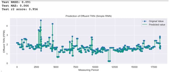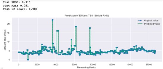 Therefore, the simple RNN and LSTM models displayed high prediction accuracy for effluent parameters, as illustrated in Table 6. These models exhibited low RMSE and MAE values, indicating high precision. Furthermore, their R2 scores were close to one, confirming the model’s accuracy. However, the R2 score may only partially be suitable for time series model prediction as it is more tailored to linear regression [28]. In the context of a neural network model, RMSE was a more suitable metric to measure model accuracy because it operates in the same unit as the model. As such, the RMSE for BOD5 prediction in the simple RNN and LSTM models showed an error of 0.246–0.247, between the predicted and original values. Regardless, TSS and BOD5 had a more extensive value range than TP, TKN, and NH3-N. Thus, the RMSE needs to be considered from the original data scaling. The more extensive range of the data will create a higher RMSE value. Notably, for TKN prediction, the LSTM model displayed considerably lower RMSE and MAE values than the simple RNN model. This result indicates that the LSTM model performs well with the high deviation parameters, as shown in Table 5, compared to its original data. Still, the other parameters show that simple RNN and LSTM models have very high accuracy that could apply to effluent wastewater prediction.