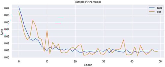 Figure 17 and Figure 18 represent the train and test loss plot over the epochs to evaluate the best two predictive models, simple RNN and LSTM, for BOD5 prediction with a training epoch of 50 and batch size of 100. The result showed that both LSTM and RNN models fit the sequence data because training loss decreased over time, achieving low error values. A good fit is determined by a training and validation loss that decreases to the point of constancy with a minimal gap between the two ending loss values [24]. Moreover, the loss of the model should be lower on the training set than on the test set. Thus, the LSTM model tends to be better than the RNN model because the loss for training and testing decreased consistently, and the final test loss was above the training loss. The BOD5 prediction model from both simple RNN and LSTM models achieved similar RMSEs of 0.247 and 0.246, respectively.