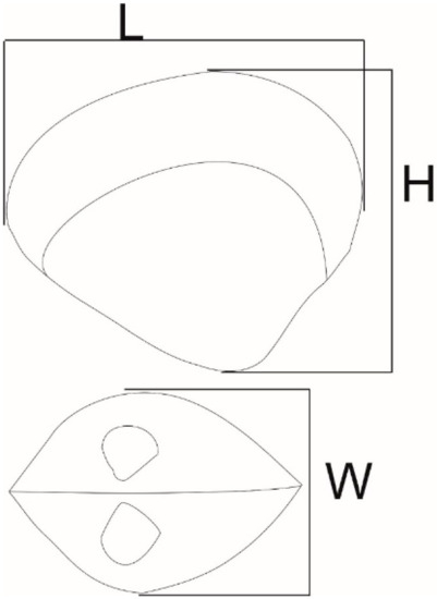 Standard measurements of the shell: H-maximum height, W-maximum width, L-maximum length [17].
