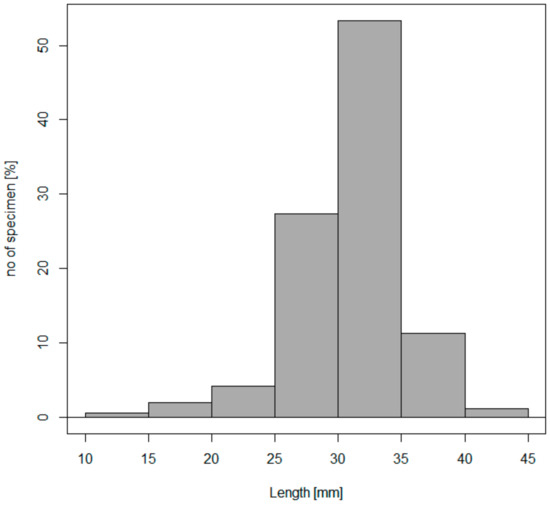 The mean length of R. cuneata in the Oder Estuary was 31.06 mm (range 12.7–43.2 mm). When subdivided into length classes every 5 mm, R. cuneata occurred in seven classes, among which individuals of 30–35 mm (53.85%) and 25–30 mm (27.60%) in length predominated (Figure 4).