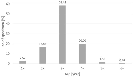 The studied population of R. cuneata consists of individuals from 6 age groups, among which individuals aged 3+ dominate, accounting for 58.42% (Figure 6).
