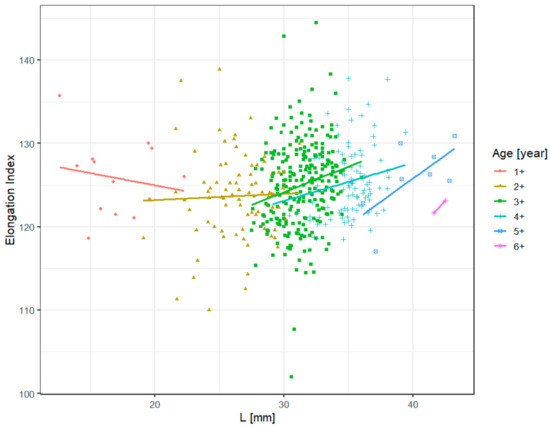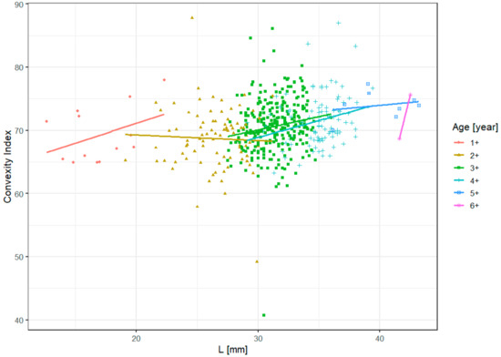 To demonstrate changes in shell elongation and convexity with increasing length, elongation, and convexity indices were determined for each age group (Figure 7 and Figure 8). Considering age groups (2+, 3+, and 4+), representative in terms of quantity, changes in these parameters were observed in bivalves from a length of about 25–30 mm. Values of these parameters in bivalves aged 2+ are relatively constant, irrespective of their length, while in older bivalves (of more than 25 mm), elongation and curving of the shell can be noted. The ANCOVA analysis shows statistically significant differences between age classes relative to L: Elongation index (for Elongation index p-value: 0.000000002627, and for age, p-value: 2.2 × 10−16, both values are statistically significant at the alpha level of 0.001).