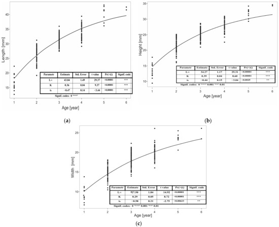 All analyses were performed in the R programming environment [34] and Statistica 13.0 (Statsoft Inc. Kraków, Poland). The data were tested for normality and homogeneity of variances with the Kolmogorov–Smirnov test, Levene test, and Breusch-Pagan test for heteroscedasticity, respectively [35]. Growth type analysis (SMA) of bivalve length, width, and height was performed in the SMATR package [36,37], and the inclination of the regression line expressed by the allometric coefficient was used as an indicator of a growth type. FSA, nlstools, magrittr, and dplyr packages were used while developing the von Bertalanffy model (model building—FSA, nlstools, magrittr, dplyr for data preparation and their possible modification). Charts presented in the article were made in R commander, an overlay that provides more flexibility while developing charts.