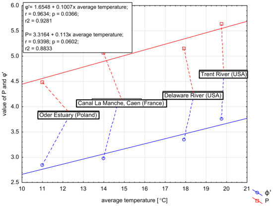 Relationship between the growth indexes (φ′ and P) of Rangia cuneata from Oder estuary and water temperature.