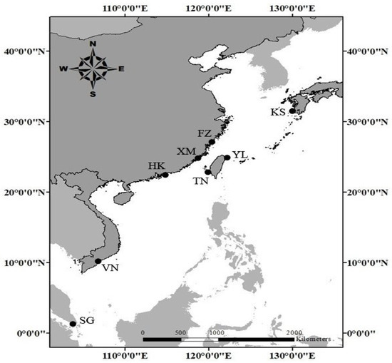 - Ya, Y.S. Morphometric Studies on Stock Discrimination of Swimming Crab (Charybdis feriatus) in the Offshore Areas of Taiwan. Master’s Thesis, Institute of Oceanography, National Taiwan University, Taipei, Taiwan, 2003; p. 56. (In Chinese). [Google Scholar]