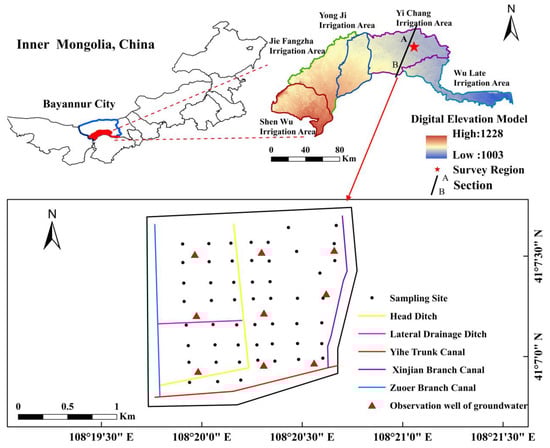 Identifying the spatial variation characteristics and distribution patterns of water and salt in the Hetao irrigation area at the canal scale could allow for the creation of a basic reference system to reveal the spatiotemporal dynamic characteristics and scale transformation features of soil attributes. In this study, typical canals in the Hetao irrigation district were selected as the study area, and the spatial distribution patterns of soil water and salt were evaluated after spring irrigation and at an early stage of crop growth. The degree of soil salinization within a typical canal was determined to provide scientific guidance for subsequent accurate improvement and sustainable development of saline-alkali land.