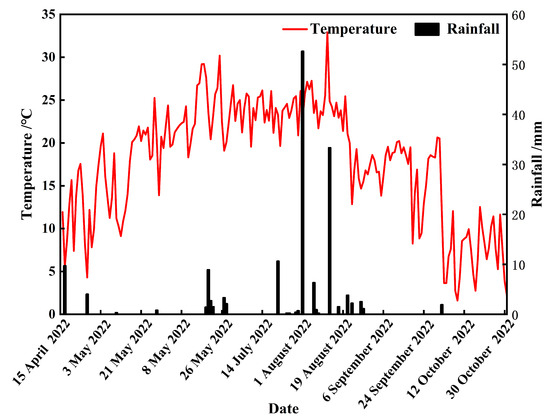 The research area is located in Wuyuan County, Bayannaoer City, Inner Mongolia Autonomous Region, China (41°6′44″ N–41°7′41″ N, 108°19′48″ E–108°20′49″ E). Its geographic location is shown in Figure 1. From the Yihe trunk canal in the south, to the highway in the north, to a new canal in the east, and to the left second branch canal in the west, the terrain is relatively flat. This area is 1022–1025 m above sea level and covers an area of 2.344 km2. Corn, sunflowers, beets, and tomatoes are grown in this area. Its annual average solar radiation is 153.44 cal/cm2, its annual sunshine duration is 2702 h, its average temperature is 17.76 °C, its accumulated temperature is 3569 °C, its frost-free period is 117–136 days its average annual amount of rainfall is 153.1 mm, and its average annual groundwater depth is 1.86 m; it has a middle-temperate continental climate. The area’s average soil organic matter content is 9.5 g/kg, and its total nitrogen content is 1.2 g/kg. The meteorological data used in this study were obtained from the National Meteorological Information Center and are shown in Figure 2.