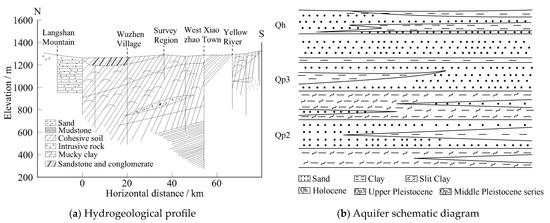 According to the geological survey, the Hetao Irrigation District is a Mesozoic–Cenozoic fault basin that formed in the late Jurassic. It is part of the Ordos platform syncline of the North China Platform in terms of its geological structure (Figure 3a). The sediments in the irrigation area are mainly derived from the river sediments of Langshan and the ancient Yellow River. According to its sedimentary structural conditions, an alluvial lake aquifer system with a fine-grained phase as its main component was formed in the Hetao Basin. The sediment particles are mainly medium-grain sand and coarse sand. The groundwater flows from west to east, with a large permeability coefficient and strong runoff conditions. As shown in Figure 3b, the aquifer in the irrigation area has complex geometry and multi-layer overlap. On the basis of Quaternary stratification, the hydrogeological characteristics of the aquifer, and its development and utilization value according to its burial conditions, it is divided into Upper Pleistocene (Qp3)–Holocene (Qh) and Middle Pleistocene aquifer systems (Qp2). The Qp3-Qh aquifer has the greatest thickness and the widest distribution. The Qp2 aquifer is widely distributed in the piedmont and uplift areas, and its burial depth is relatively shallow.