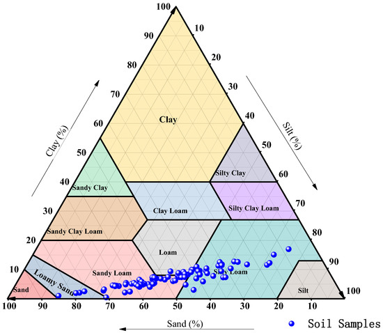 A laser particle size analyzer was used to test the particle size distributions of the ground and sieved soil samples (HELOS & RODOS, Sympatec, Clausthal, Germany). The U.S. Department of Agriculture soil particle grading standard [29,30] was used for the analysis. The soil particle sizes were divided into clay (0–2 μm), silt (2–50 μm), and sand (50–2000 μm). The soil textures in the study area were divided into five categories: loam, sandy loam, silty loam, and silty loam (Figure 4).
