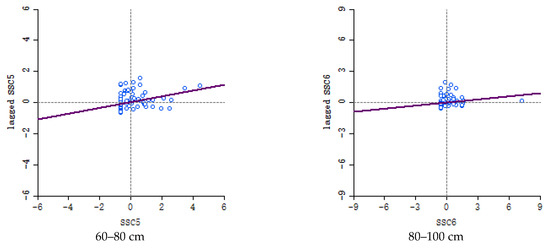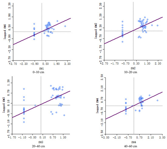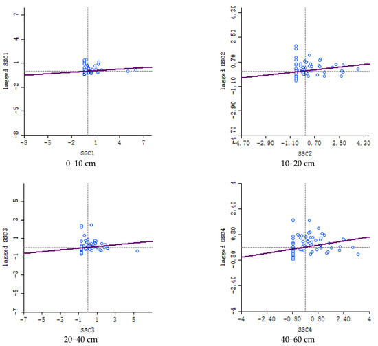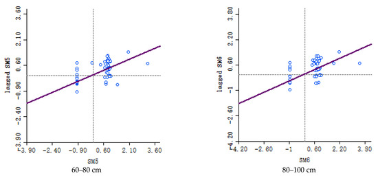 To further study the degree of spatial dependence and the local distribution pattern of soil salinization in the test area, the test area was latticed at a scale of 200 × 200 m to improve research accuracy. As shown in Figure 5, Moran’s I was used as an index to measure the spatial autocorrelation of soil salt content (SSC) and soil moisture (SM). The Geoda platform was used to analyze the global and local spatial autocorrelation of soil salt content and conductivity, and a Moran’s I scatter plot was obtained.