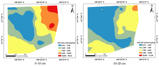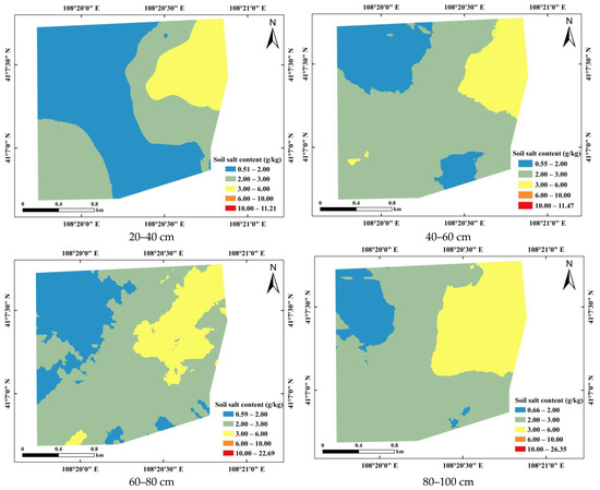 According to the classification standard for salinized soil [23], soil is divided into non-saline (salt content less than 2 g/kg; secure crop growth), mildly saline (salt content of 2–3 g/kg; mild crop inhibition), moderately saline (salt content of 3–6 g/kg; moderate crop inhibition), severely saline (6–10 g/kg; severe crop inhibition), and saline soil (salt content greater than 10 g/kg; a crop-damaging amount of salt). As shown in Figure 10a, the proportion of areas with different salt and water levels ranges in the different soil layers in the test area increased layer by layer by 18%. The soil salt content increased by 9% layer by layer from 0 to 40 cm in the soil with a salt content of ≤2 g/kg and by 2% and 6% for the soil with a salt content of between 2 and 3 g/kg, respectively. The areas with a 3–6 g/kg soil salt content were 33%, 29%, and 15% decreased layer by layer, respectively. Severely saline soils with 6–10 g/kg soil salt content appeared at the soil layers of 0–10 cm and 10–20 cm, accounting for 12% and 1% of samples, respectively. A soil salt content of >10 g/kg was only observed in samples at a depth of 0–10 cm, accounting for 5% of the total area and located mostly in the local wasteland in the transition area from cultivated land to villages.