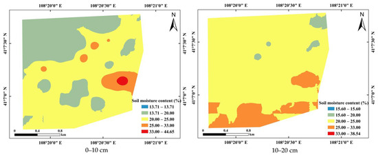 As shown in Figure 10b, with an increase in soil depth, soil water content gradually increased. Low-water-content areas of 13% to 20% occurred in the 0–10, 10–20, 20–40, and 40–60 cm soil layers, accounting for 33%, 3%, 2%, and 6% of the total land, respectively. The proportions of the area with a water content of 20–25% were 60%, 82%, 60%, 18%, 3%, and 1%, respectively. The proportions of the area with a water content of 25–33% were 6%, 15%, 38%, 74%, 89%, and 92%. The high-value area with a water content greater than 33% was located in deep soil, and a change in the area’s proportions was not evident [24,36]. Sampling was carried out at the beginning of the growth period in this experiment, and groundwater and its salt moved upward continuously due to strong evaporation, which was the main source of the recharge of the soil water and salt content in the study area.