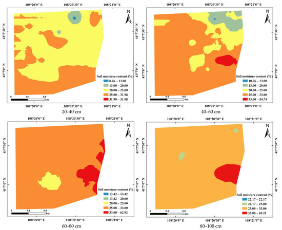 It is generally believed that when the coefficient of variation is less than 10%, there is weak variability, while values of 10–100% indicate moderate variability and those greater than 100% indicate strong variability. The coefficient of variation of the soil salt content in each layer was strong, except in the 20–40 and 40–60 cm soil layers. The soil moisture content in each layer had a moderate degree of variation. The variation coefficients of soil salt content and soil water content in the 0–60 cm soil layer decreased layer by layer, indicating that the spatial variability of soil water and salt decreased with increasing soil depth. This may have been due to the influence of factors affecting the spatial variations of the soil water and soil salt content (such as climate, soil texture, and human activities) weakening with increasing soil depth. In addition, the coefficient of variation of the soil salt content was higher than that of the soil water content at the same depth, indicating that the spatial variability of the soil salt content was stronger than that of the soil water content.