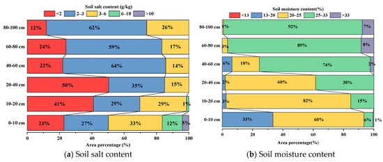 The proportionate areas of different soil salt and water content intervals in different layers.