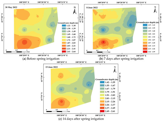 The spatial distribution of shallow groundwater depth in the study area is shown in Figure 11 through interpolation. It can be observed that the groundwater depth changes significantly before and after spring irrigation. The groundwater burial depth on the side of the new channel is obviously less than that on the side of the second channel on the left, likely due to the fact that only some farmers in the area use the new channel for spring irrigation. Furthermore, the drainage ditches in the study area have an impact on the change in groundwater burial depth. Figure 11 demonstrates that the groundwater burial depth in the right region of the study area decreases rapidly, in part, after spring irrigation. This test also reveals that the groundwater burial depth of the drainage ditches exhibits a similar trend of change, indicating its effective role in drainage. In terms of water quality, the EC value of the water in the ditch before spring irrigation was 2.7 dS/m, which increased to 3.5 dS/m after spring irrigation, resulting in a 29.6% increase in salt value.