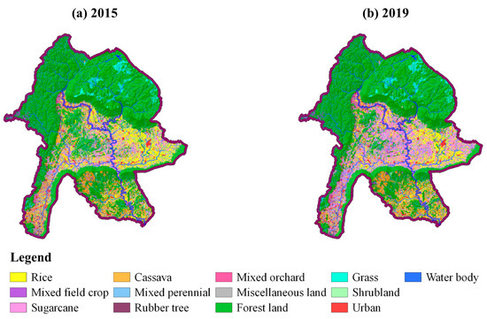 This study analyzed future changes in land use using the Land Change Modeler (LCM), which is a subprogram of a software system called IDRISI Selva 17.0 developed by Clark Labs, Clark University, USA [34]. This model analyzed the tendency of land use change based on land use data from 2 time periods—namely 2015 and 2019 (Figure 2)—to gain temporal correlations. Then, the LMC analyzed the transition potential of possible land use and cover according to variables related to future changes using Multi-Layer Perceptron (MLP), which created potential maps of changes [35].