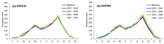According to the comparison between the four periods of time and the BL year, the average monthly runoff in the SSP585 scenario between 2061–2100 would be higher than the SSP245 scenario and the BL year, particularly in terms of the maximum in October, lasting until the end of rainy season, and the dry season from December to June of the next year. For this reason, it could be described that the future average monthly runoff at the outlet point from the QSWAT would be close to the BL year during the period of 2023–2060, and it would be higher during the period of 2061–2100, particularly in the SSP585 scenario, as mentioned previously. In addition, the result also displayed periods of change in the maximum runoff in at least one month, and it was consistently high at the end of the rainy season until the dry season of the next year. This change would influence operational plans for the improvement of water resource management for flood control or water storage for drought periods [61,62].