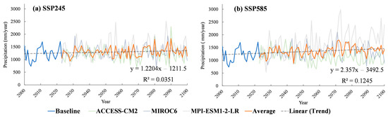 According to the analysis of the future monthly average precipitation of the UCB obtained from the three GCMs in comparison with the 2000–2022 BL year, the result was in line with the BL, as shown in Figure 3. The future monthly precipitation of the SSP245 scenario was slightly higher than the BL year. In the SSP585 scenario from May–October in 2061–2100, the precipitation would be higher, especially in August (300–350 mm). For the initial prediction during 2023–2060, it showed a value close to the BL year. According to the annual precipitation calculation, the period of 2000–2022 showed an average precipitation of 1221.9 mm per year. When comparing this with the result from the ACCESS-CM2 model, the precipitation decreased by 1.8–3.4% for the SSP245 scenario and 11.3–14.6% for the SSP585 scenario. The MIROC-6 and MPI-ESM1-2-LR models showed 2.3–9.9% and 10.1–21.8% higher annual average precipitation, respectively. Both the SSP245 and SSP585 scenarios also had 2.2–14.9% and 10.7–53.6% higher values, respectively. The results of the regression analysis for annual precipitation in both of the SSPs, using the coefficient of determination (R2), are depicted in Figure 4. In the case of the SSP245 scenario (Figure 4a), the annual precipitation between 2023–2100 averages 1302 mm (+6.55% from BL), which is equivalent to an average yearly increment of 1.03 mm. Meanwhile, the SSP585 scenario (Figure 4b) exhibits 11.53% higher annual precipitation than the BL year, with an average of 1362.8 mm, or a mean yearly increase of 1.81 mm. The slope coefficient serves as a crucial variable indicating the rate of variation in the precipitation conditions. Notably, the linear regression for both the SSPs follows a positive equation, indicating an upward trend. However, due to the low R2 values, it can be inferred that the fluctuation in the ratio for the SSP245 scenario experiences a gradual increase, as evidenced by the slope and R2. Conversely, in the SSP585 scenario, the slope of the trend line and R2 show a slight increase.