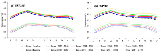 After gaining the monthly average from the maximum and minimum temperatures analysis, as shown in Figure 5, both scenarios showed averages close to BL year during the initial predicted year (2023–2040). The SSP245 scenario between 2041–2100 showed a slightly different average, or its value increased in the future time periods. On the other hand, the SSP585 scenario showed a higher trend than the BL year. Its average maximum and minimum temperature during 2081–2100 was 40.3 °C in April, while the average of BL year in the same month was 36.5 °C, or increased by 10.4%. According to Figure 6, the annual maximum and minimum temperatures during 2000–2022 were 33.1 °C and 23.1 °C, respectively. When comparing each model, the SSP585 scenario was higher than the SSP245 scenario. The ACCESS-CM2 model displayed an average maximum of 35.4 °C, which was 6.9% higher than the BL year average, which increased from 0.5–3.8 °C between 2023–2100 in the SSP585 scenario. In the case of the average minimum temperature, the SSP245 scenario increased from 0.6–2.1 °C, while the SSP585 scenario increased from 0.6–4.1 °C. The ACCESS-CM2 model displayed an average maximum of 25.6 °C, which was 10.8% higher than the BL year average. Both scenarios had an average maximum temperature of 26.8 °C, which was 16.0% higher than the BL year average. When considering the overall long-term changes in the maximum and minimum temperatures, both of the predicted scenarios tended to be higher in terms of the temperature.