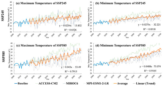 When evaluating the trend of the changes in the maximum and minimum temperatures over the long-term, as determined by the slope coefficient, the analysis results reveal that the linear equations exhibit a positive pattern. Comparing the average maximum temperature of 33.1 °C during the BL year with the SSP245 and SSP585 scenarios (see Figure 6a,b), which display 34.3 °C (+3.62% from BL) and 35.1 °C (+6.04% from BL), respectively, for the period 2023–2100, we find an average annual increase of 0.016 °C and 0.025 °C, respectively. Meanwhile, regarding the minimum temperature, the BL year’s average of 23.1 °C is compared to the SSP245 and SSP585 scenarios (see Figure 6c,d), which have averages of 24.5 °C (+6.06% from BL) and 25.4 °C (+9.96% from BL), respectively. This analysis reveals an average annual increase of 0.018 °C and 0.029 °C. Considering the slope of the linear regression line and the R2 from both cases, which are predicted to be between 0.65–0.92, it can be concluded that the relationship between the annual mean over time is increasing at a high rate. In particular, the minimum temperature exhibits a rapid rate of increase.