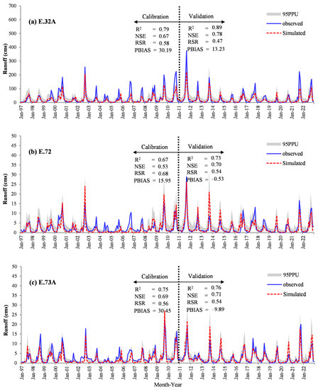 The sensitivity analysis using SWAT-CUP provided the optimal parameters for the UCB. These parameters were used for correcting the parameter in the QSWAT and calculating the R2, NSE, RSR, and PBIAS of Stations E.32A, E.72, and E.73A. The correlation in the statistics between the monthly 14-year calibration (1997–2010) and monthly 12-year validation (2011–2022) are summarized in Table 5 and Figure 8. According to the Table, the values of the R2, NSE, RSR, and PBIAS were acceptable and standardized [48] based on the criteria for the monthly runoff evaluation, as shown in Table 6.