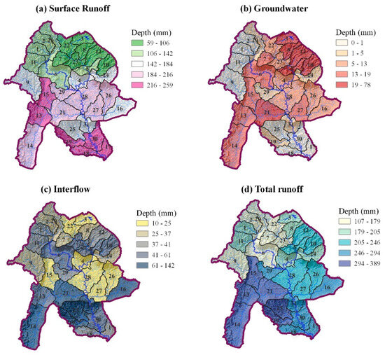 In considering the spatial change dimension according to the boundary of the subbasins, Subbasins 17, 18, 19, and 30 had the highest surface runoff (216–259 mm), as shown in Figure 10a, because they are the last stages of the flow. However, it was lower in the midstream because it is agricultural land. The lowest surface runoff was found in the north because it is a headwater area mostly covered with forest land, where a small amount of surface runoff can be stored [55,56]. The midstream had a high chance of high runoff because the infiltration potential is lower [57]. As can be seen in Figure 10b, the spatial change in groundwater was from a moderate-to-high level in the north and midstream, between 5–78 mm. The high level of runoff mostly occurred in the upper forest-covered and basin swamp, which has a high storage capacity [58,59]. Subbasins 3, 5, 8, 10, and 12 had the highest storage capacity (19–78 mm), while Subbasins 6, 7, 13, 14, 15, and 21 had the second highest storage capacity. There were two subbasins with a very low level of groundwater. including the northwestern (Subbasins 1, 2, 9, 11, and 20) and southeastern (Subbasins 17, 18, 25, and 30) areas. The cause of this low groundwater was the fast flow at the high slope area, which is the outlet point; this result is consistent with the studies of Carroll et al. [59] and Nouayti et al. [60]. In the case of interflow, most of the spatial changes could be seen at the outlet point of Subbasins 1, 10, 18, 19, and 25, as well as in the southwestern lowland, where distributary flowed across it (Subbasins 13 and 14), and some in the midstream, including Subbasins 6 and 23, as presented in Figure 10c. Most of all, in considering the three runoff components represented by the spatial condition of the total runoff, it was found that the upper area with a high slope and covered with forest land had a low capacity to give the total runoff. However, according to the physical characteristics of the UCB, the total runoff from the upper area flowed down to the southern outlet. From this situation, its value was high, at between 205–389 mm, as shown in Figure 10d.