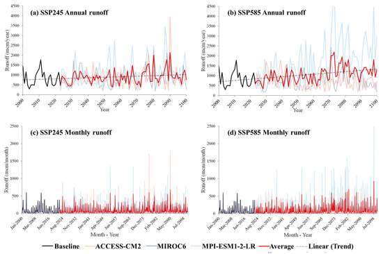 Long-term temporal changes in annual and monthly runoff during 2000–2100.