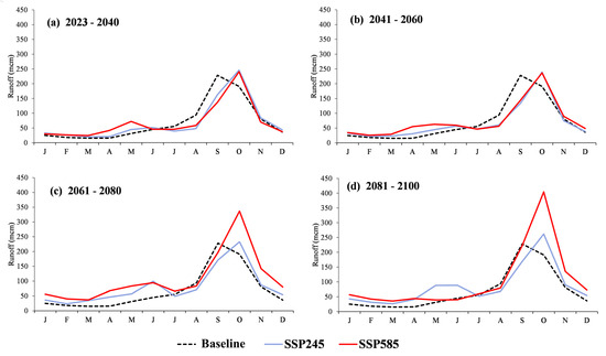 The results of this study indicated the trend of the overall changes in long-term runoff. The result of the temporal changes in the average monthly runoff at the outlet point, analyzed using three types of GCM under four future periods of predictive years between 2023–2100 based on SSP scenarios, can be seen in Figure 12. The average future runoff between 2023–2060 (Figure 12a,b) was close to the BL year. In terms of seasons, the dry season (March–June) showed a slightly higher value than the BL year (1.3–247.6%); however, it decreased in July and August. In the rainy season (August), the average runoff was higher and showed its maximum in October, with both scenarios sharing close values, between 236.6–245.9 MCM. Similarly, the average 12-month runoff of both scenarios in the dry and rainy seasons between 2061–2100 showed an obvious difference for SSP585 in October (maximum runoff) of 336.7 MCM during 2061–2080 (76.4% higher than BL year) and 404.3 MCM during 2081–2100 (111.8% higher than BL year) (Figure 12c,d). For the SSP245 scenario, the maximum was close to the BL year; however, the simulation result of the future monthly runoff revealed that the maximum runoff was in October, which was different from the BL year, which had its maximum in September.