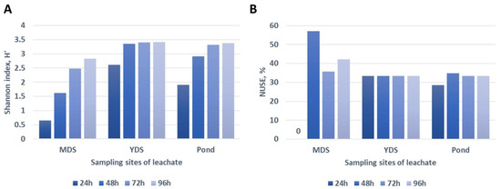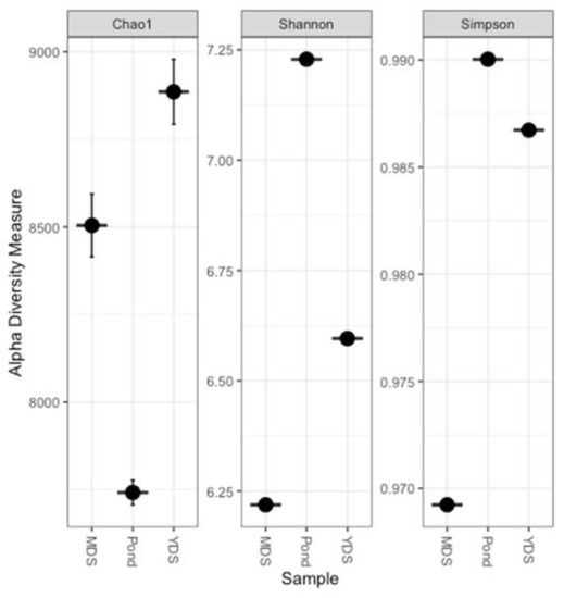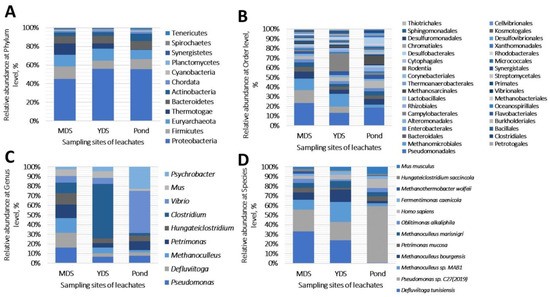 - Metagenomic analysis showed a prevalence of Proteobacteria (43.76–54.70%), followed by Firmicutes (8.51–13.11%) and Euryarchaeota (9.37–12.53%) in all three leachate samples. Regarding the inner diversity of samples, the highest Chao1 measure was obtained for YDS—8885.95, followed by MDS and pond, whereas the richness estimator, e.g., Shannon index, was the highest for pond—7.23, followed by YDS and MDS. Similarly, the highest value of the evenness estimator—the Simpson index—was observed for the pond—0.99, followed by YDS and MDS.
