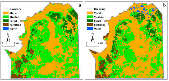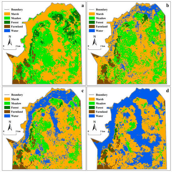 - Ning, S.; Ke, K.; Yu, M.; Chen, X.M.; Li, Y.Z.; Zhou, D.; Zhan, C.; Yang, J.S.; Yu, Y.; Zhang, J.J.; et al. Prediction about Areas of Various Types of Land Cover in Honghe National Nature Reserve in 2023. Wetl. Sci. 2019, 17, 80–87. [Google Scholar] [CrossRef]