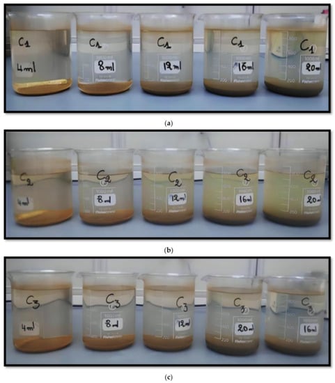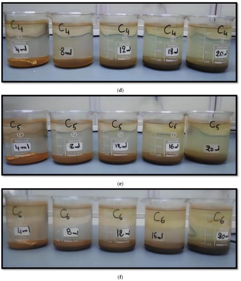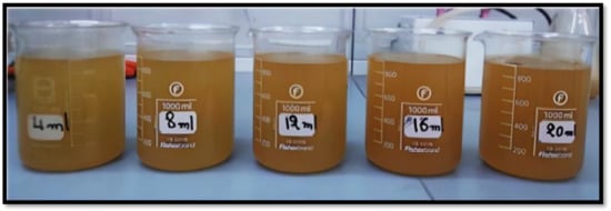 Suspended solids are a common problem in the treatment of oily waters. Suspended solids can include organic and inorganic particles as well as non-dissolved oils. If these materials are not effectively removed from the water flow, they can cause problems such as pipe blockages, equipment wear, and a decrease in the overall effectiveness of water treatment. Common methods for removing suspended solids in oily waters include filtration, gravity separation, flotation, and the use of chemicals to coagulate or flocculate the suspended solids. Each treatment method can be adapted to meet the specific needs of each application, depending on the quantity and nature of the suspended solids present in the water. In general, the choice of treatment method will depend on the complexity of the suspended solids, the concentration of oil and other contaminants, as well as the quantity of water to be treated. Table 4 presents the analysis of TSS (total suspended solids) of water at the inlet and outlet (API). The samples before the injection of the coagulant are presented in Figure 1.