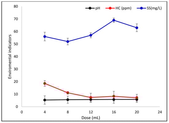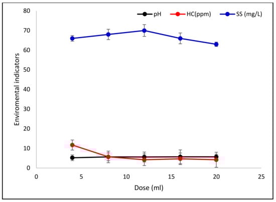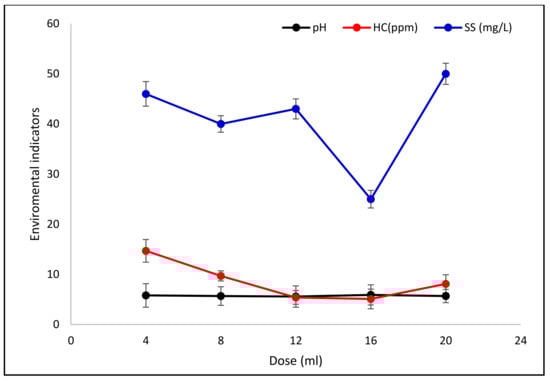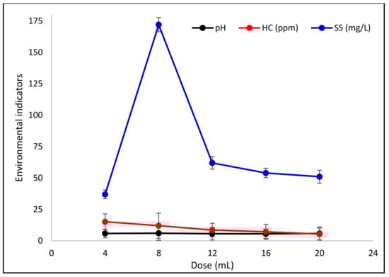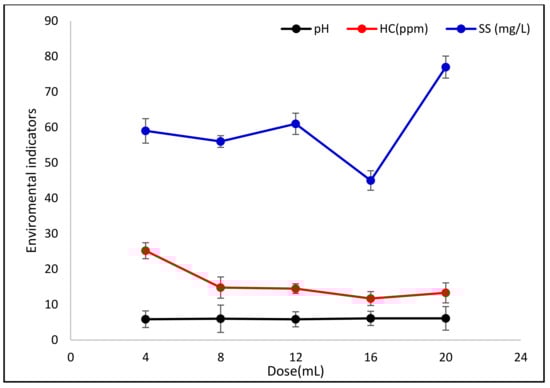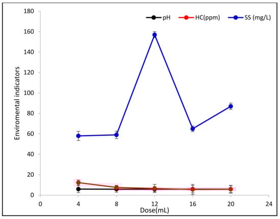 Figure 8 represents the evolution of the suspended solids (SS) rate, hydrocarbon content, and pH according to the dose of coagulant C6.